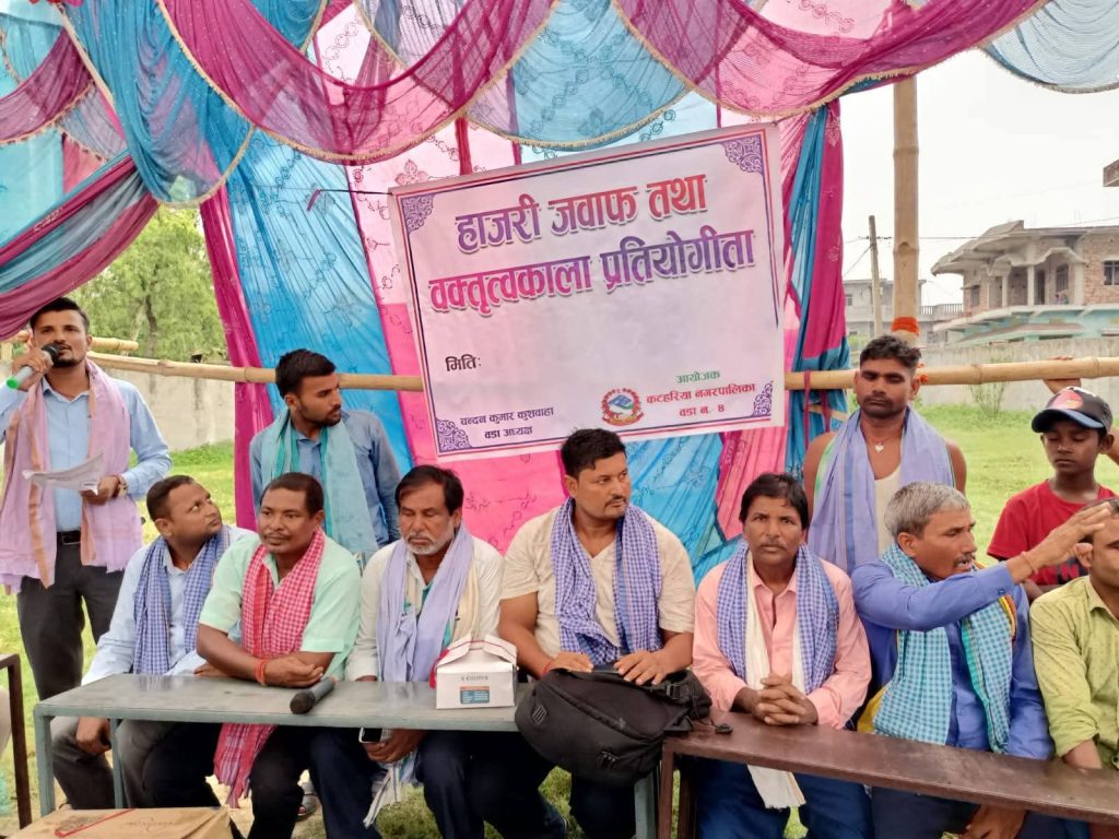 रौतहट, असार १५ गते – रौतहटको कटहरिया नगरपालिका वडा नम्बर ४ को आयोजनामा एक प्रेरणादायी हाजिरीजवाफ प्रतियोगिता कार्यक्रम भव्य रूपमा सम्पन्न भएको छ। यस कार्यक्रमको प्रमुख अतिथि वडा नं. ४ का वडाअध्यक्ष चन्दन कुशवाहा हुनुहुन्थ्यो भने कार्यक्रम उहाँकै विशेष पहलमा सम्पन्न भएको हो।