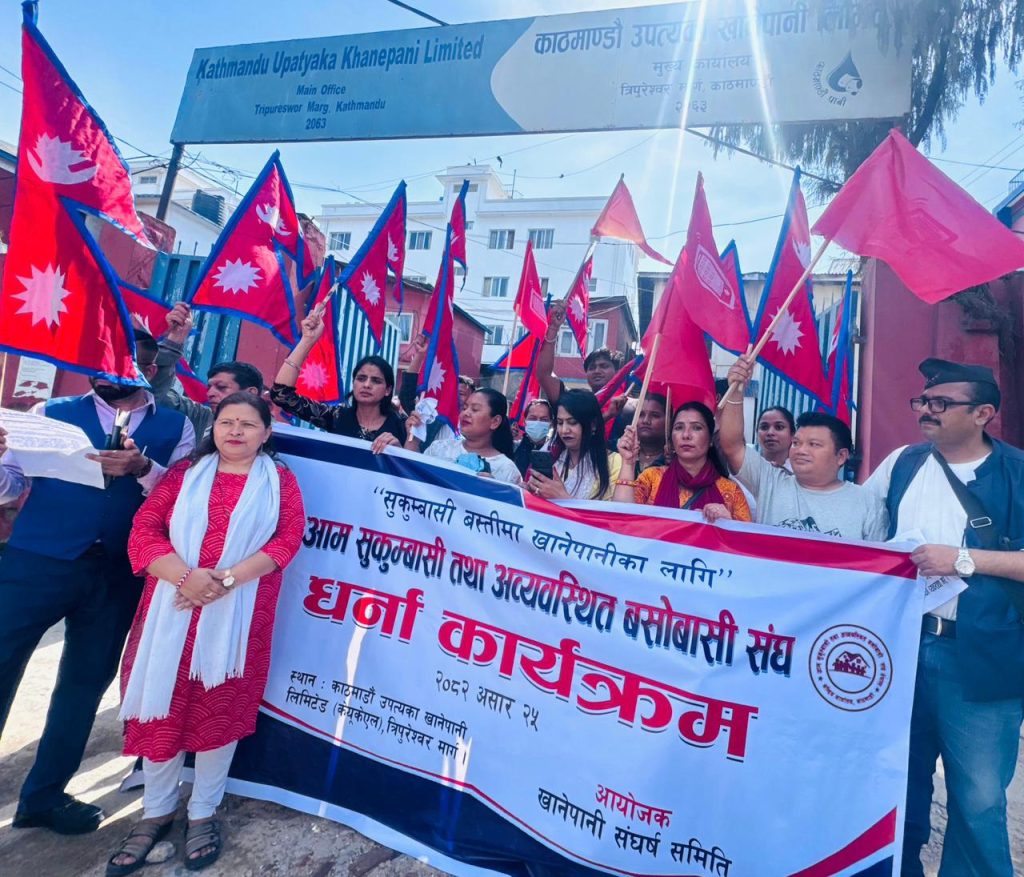 आम जनता पार्टी (आजपा) निकटको आम सुकुम्बासी तथा अव्यवस्थित बसोबास संघले खानेपानीको माग काठमाडौं उपत्यका खानेपानी लिमिटेड (केयूकेएल) को कार्यालय घेरा उगर्दै धर्ना दिएका छन् ।
