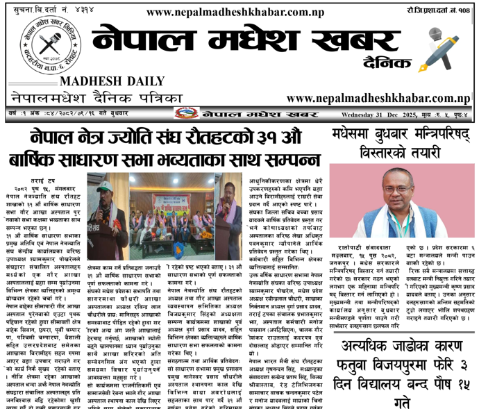 १६ पुस २०८२,बुधवार, प्रकाशित नेपालमधेश खबर दैनिक पत्रिका पढनुहोस्।