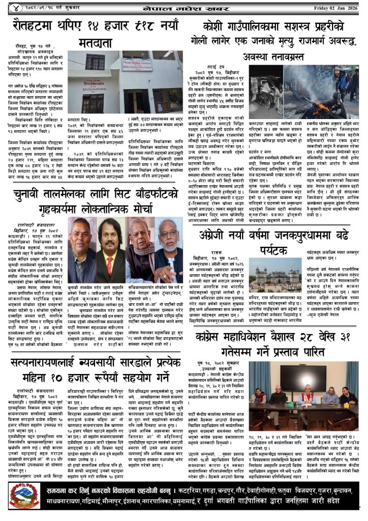 १८ पुस २०८२,शुक्रवार, प्रकाशित नेपालमधेश खबर दैनिक पत्रिका पढनुहोस्।