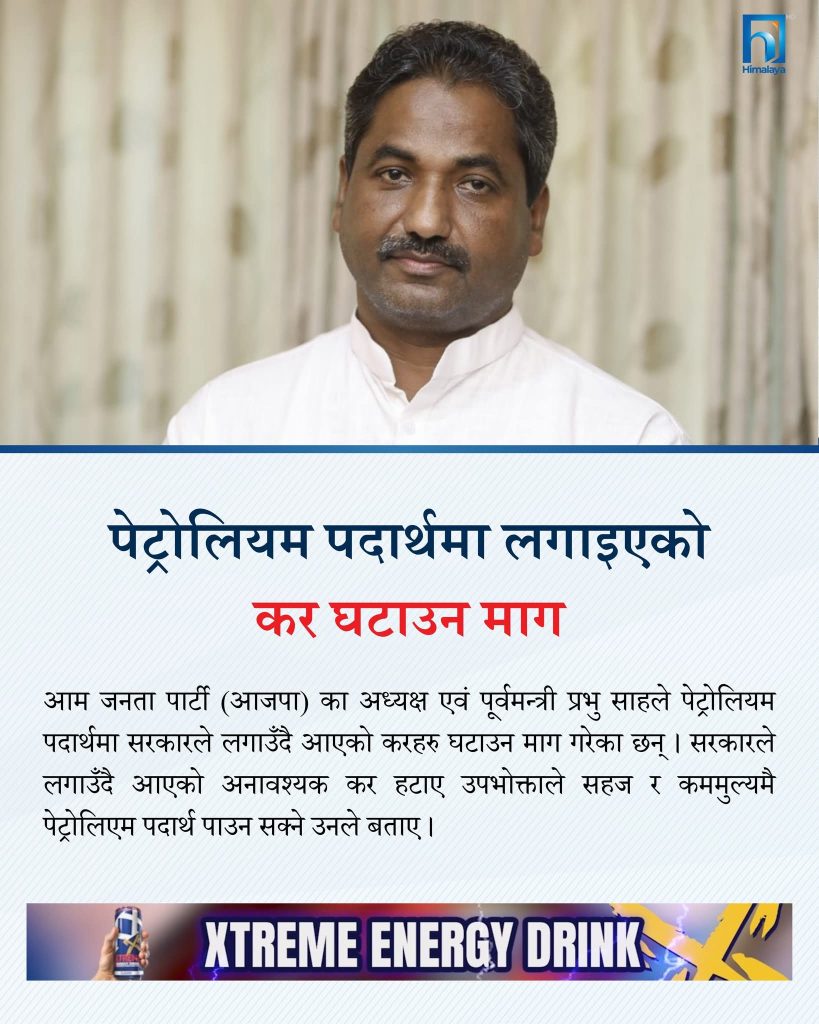 आम जनता पार्टी (आजपा) का अध्यक्ष एवं पूर्वमन्त्री प्रभु साहले पेट्रोलियम पदार्थमा सरकारले लगाउँदै आएको अनावश्यक करहरु हटाउन माग गरेका छन् । सरकारले लगाउँदै आएको अनावश्यक कर हटाए उपभोक्ताले सहज र कममुल्यमै पेट्रोलिएम पदार्थ पाउँन सक्छन् ।
