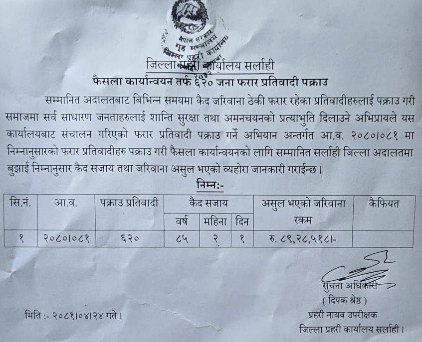 सर्लाही जिल्ला अदालतबाट कैद सजाय एवं जरिवाना पाएर फरार रहेका प्रतिवादीहरुलाई पक्राउ गरी समाजमा अमनचयन कायम गराई आम मानिसलाई शान्ति सुरक्षाको प्रत्याभुति दिलाउने अभिप्रायले एक बर्षमा ६२० फरार प्रतिबादीहरुलाई पक्राउ गरेर अदालत समक्ष बुझाइएको जिल्ला प्रहरी कार्यालय सर्लाहीका प्रवक्ता एवं डिएसपी दिपक श्रेष्ठले जानकारी दिए ।