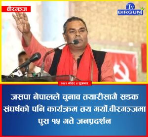 ६ मंसिर,वीरगञ्ज । जनता समाजवादी पार्टी (जसपा) नेपालले आगामी निर्वाचनको तयारीसँगै सडक संघर्षका कार्यक्रमहरू पनि एकसाथ अघि बढाउने भएको छ।...
